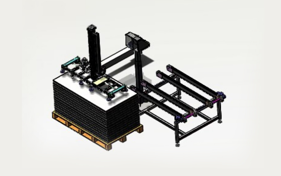 自動排版機的主要功能單元有:玻璃輸送定位系統(tǒng)、抓取行走系統(tǒng)、視覺檢測系統(tǒng)、電控系統(tǒng)等;通過以上功能單元,實現(xiàn)了將自動串焊機串焊好的電池串,按照工藝尺寸要求和排版方向順序自動排版鋪設到玻璃(EVA已經(jīng)鋪設)上,組成電池串陣列。玻璃/EVA通過傳輸線傳輸至指定位置,機械手抓取電池串實現(xiàn)CCD定位、自動旋轉、自動排版功能。設備通過同步帶傳輸與自動生產線對接,實現(xiàn)了自動流水作業(yè)。